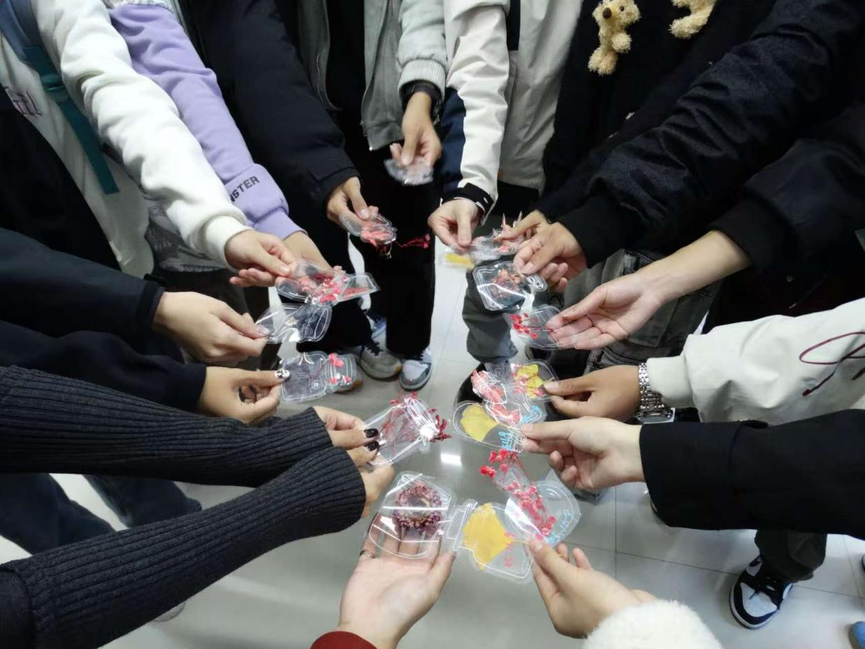 在“鲜花赠己”环节中,同学们凭亲手制作的落叶书签,即可领取新鲜鲜花。同学们将花束轻捧胸前,用镜头定格温馨时刻,正是这场活动“悦纳自我”的意义所在。